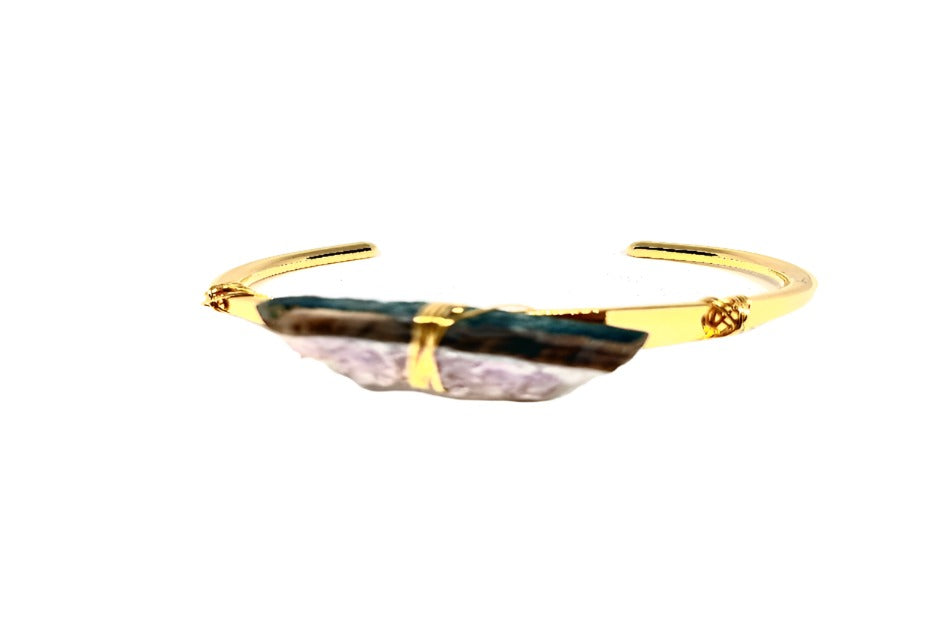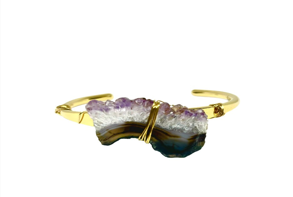 An easy way to rock your favorite crystal. These earthy, textured, Amethyst crystals are securely and tightly hand wire wrapped to the vintage brass cuff base.
