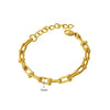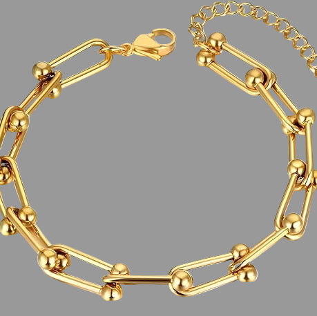 Crafted from durable stainless steel and plated in radiant 18k gold, this bracelet features elongated U-shaped links accented with subtle spheres for a modern twist on classic chain design. With a generous 18+5 cm adjustable length and a bold 7 mm width, it’s made to layer, stack, or shine solo.