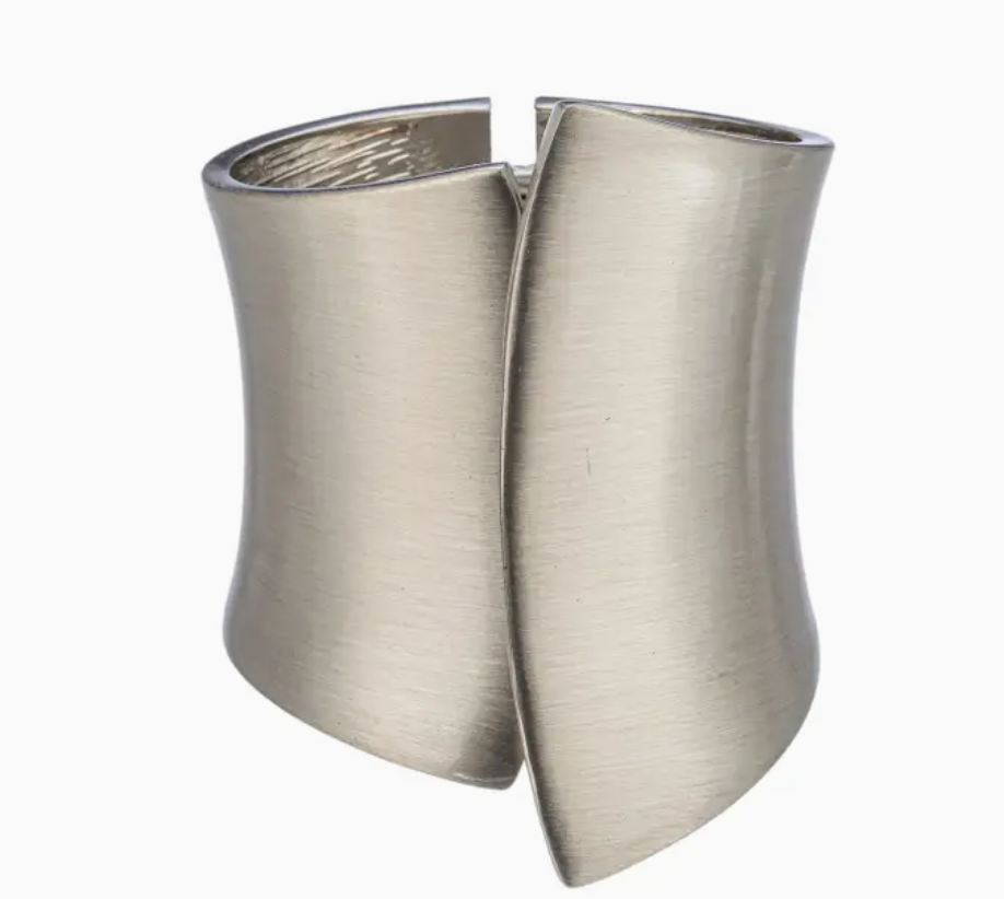 This cuff bracelet features a sleek silver and gold coloration that can pair with virtually any colored outfit.