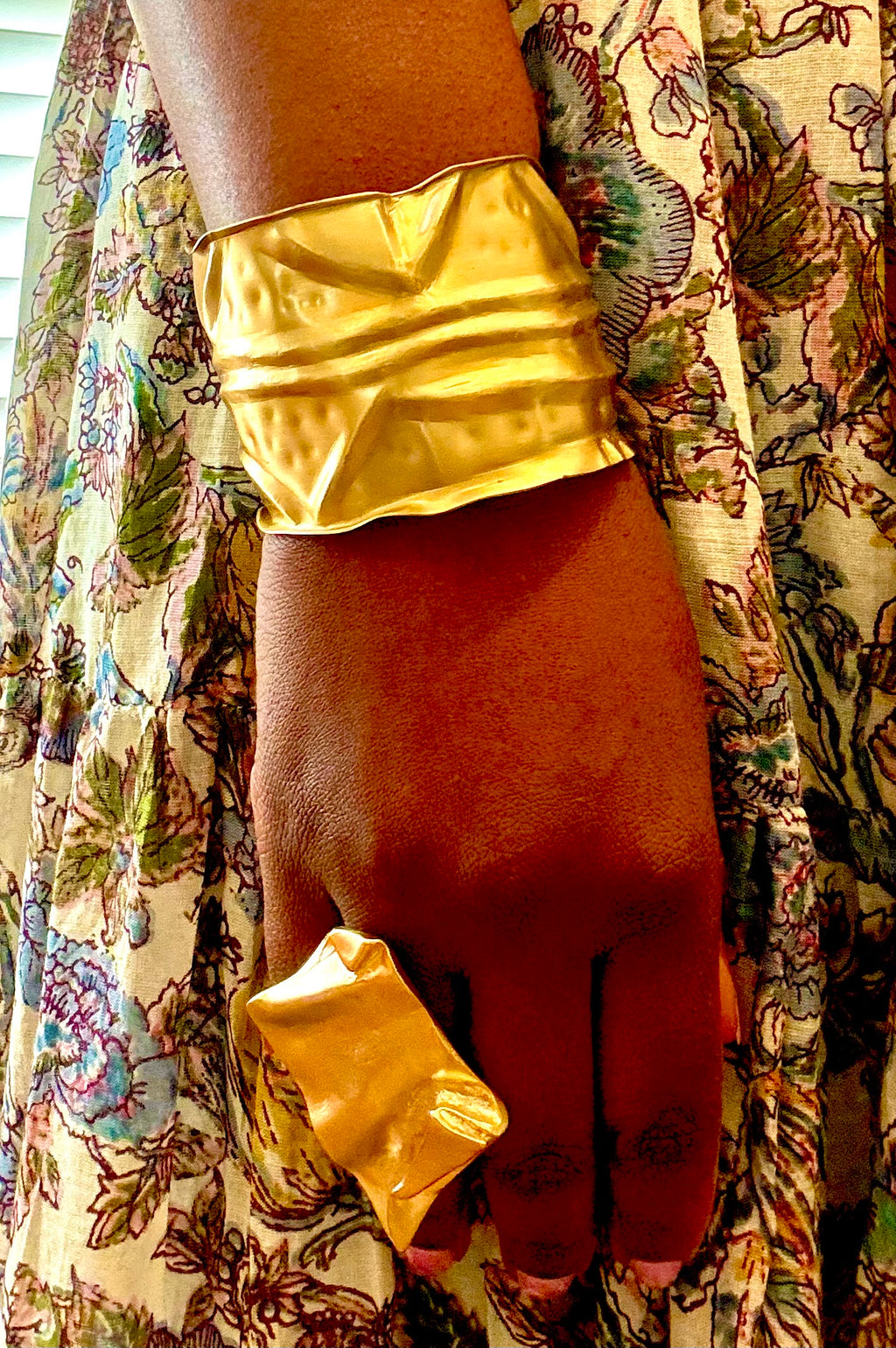 Make a statement with this distinctive, modern adjustable ring.   The crumpled texture gives an artistic and sculptural look.  Available in Silver and Gold.