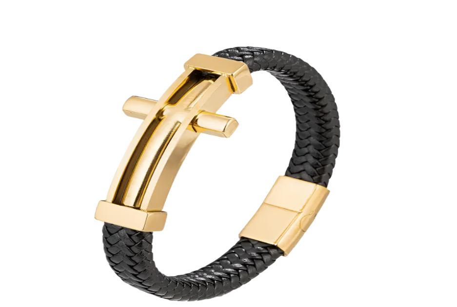 This leather bracelet is a unique accessory because of its double cross design. The double cross is comprised of gold tone titanium and is further complimented by a gold titanium clasp for an extra pop of color.