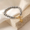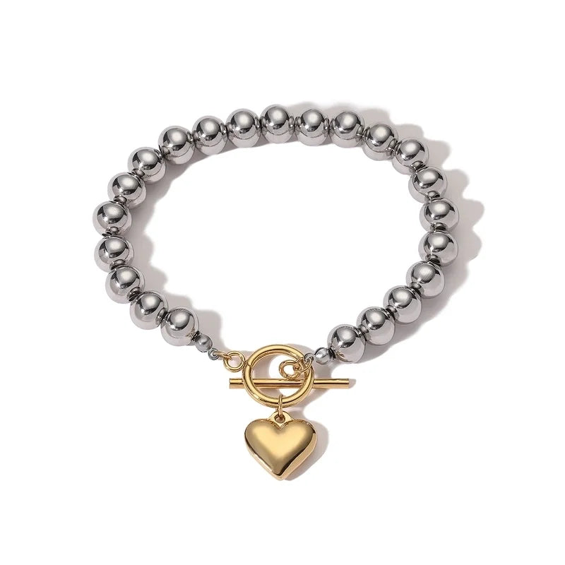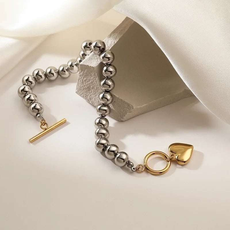 Silver shimmer meets golden warmth in this timeless piece. Our Heartline Toggle Bracelet features a sleek strand of metallic beads, anchored by a vintage-inspired gold toggle clasp.