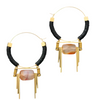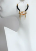 Gold plated brass hoops with black vulcanite, carnelian, and brass drops. Each earring weighs .22 oz. and measures 2.625 inches long.