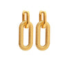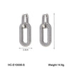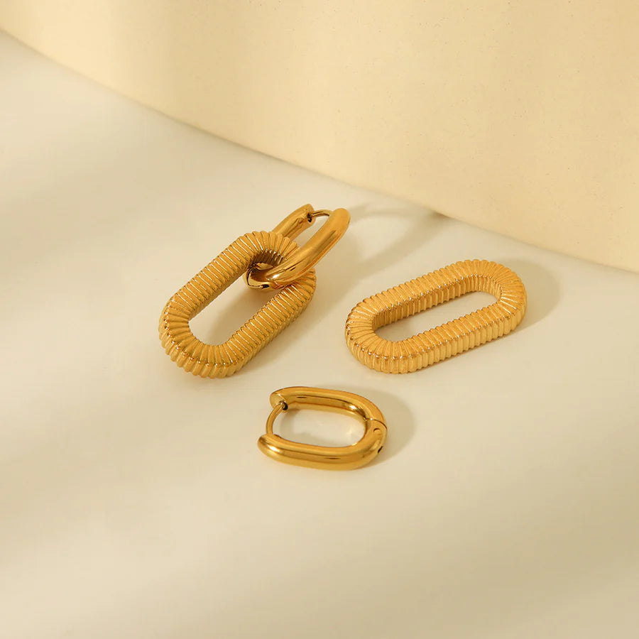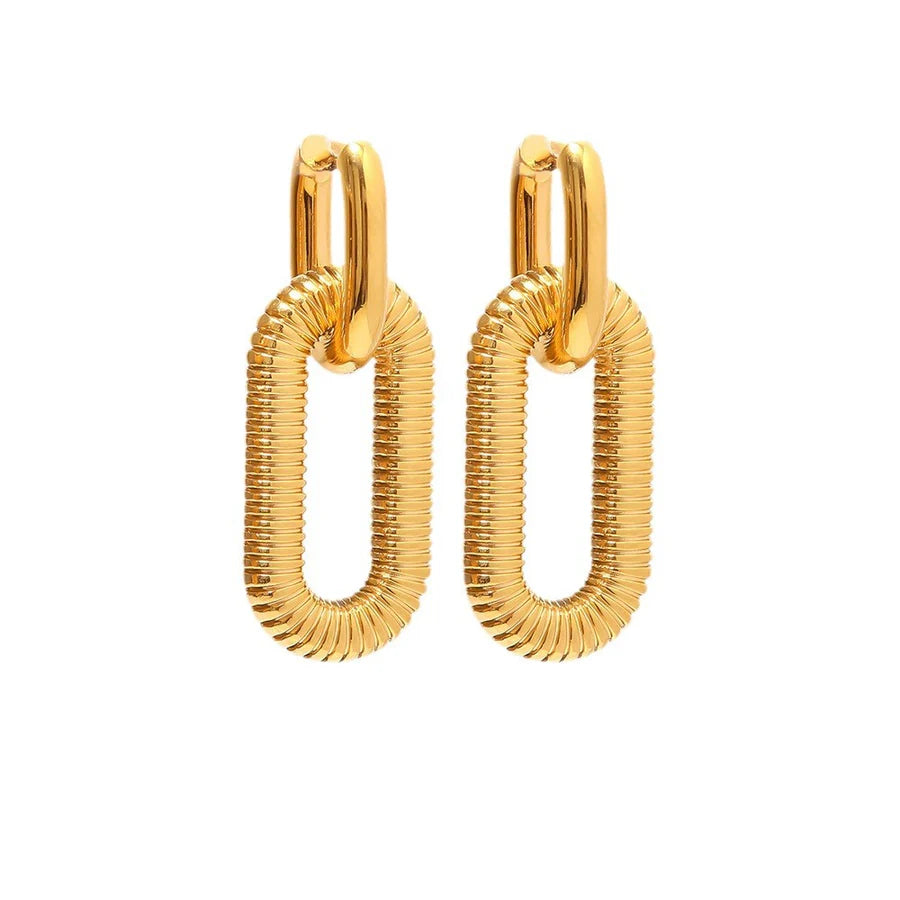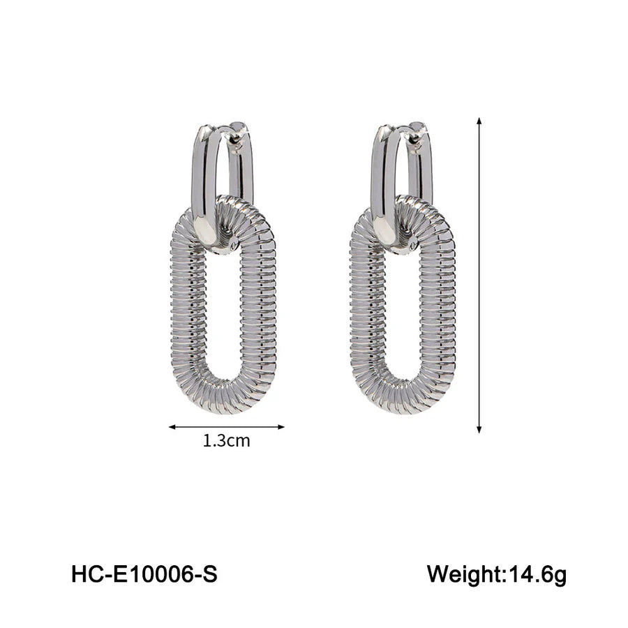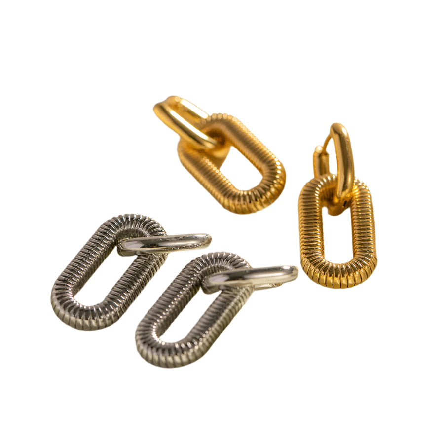 These earrings have a modern, eye-catching design. They consist of two distinct elements: a smaller, smooth, circular hoop at the top, which is polished to a reflective shine, and a larger, elongated oval-shaped component below. The lower piece is crafted from tightly coiled metal, giving it a spring-like texture. This combination of sleek and intricate textures makes the earrings stand out as both contemporary and elegant.