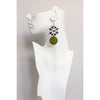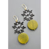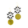 Gold plated brass hooks with black powder coated brass and green painted wood. Each earring weighs .18 oz. and measures 3.5 inches long.  Each piece is unique so stones and glass may vary in shape, size, and color. Stone inclusions may be visible to the eye and are considered a part of their beauty.