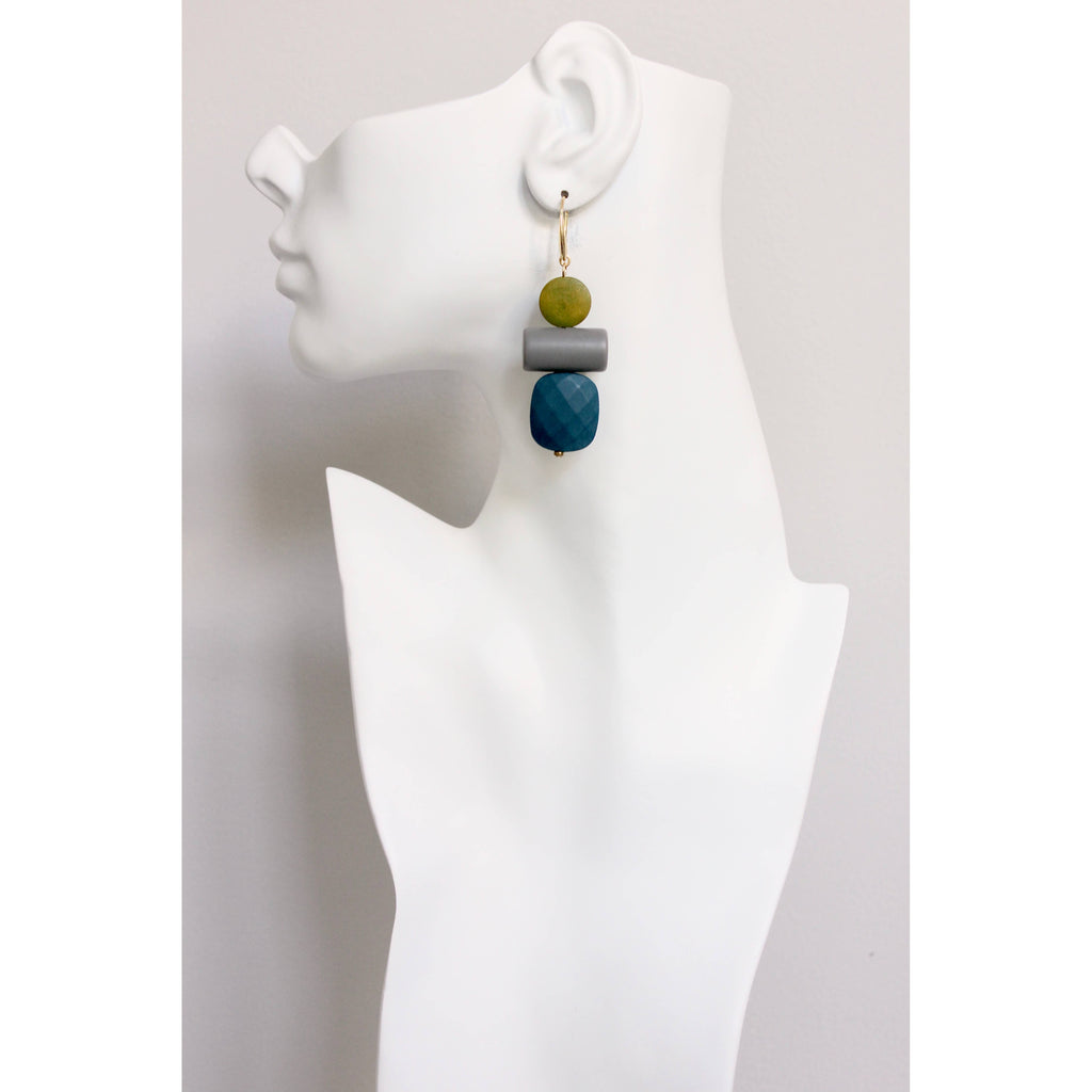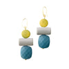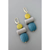 These earrings have a playful and modern geometric design, featuring stacked shapes in soft, contrasting colors of yellow, gray, and a faceted blue stone at the bottom.
