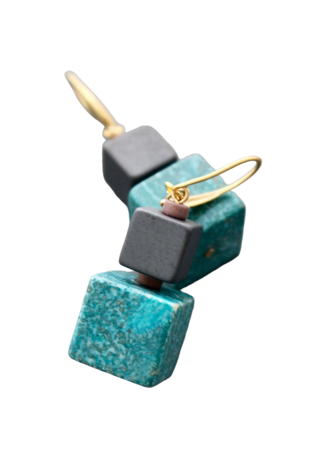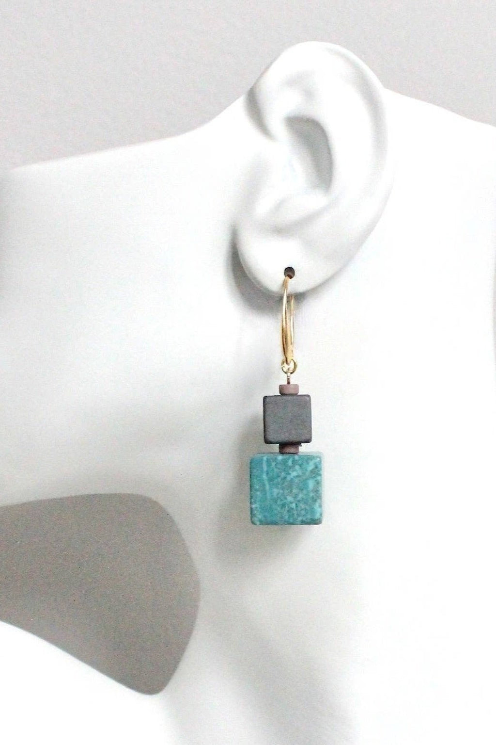 18k gold plated brass hooks with hematite and turquoise cubes. Each half pair weighs .47 oz and measures 2 inches.