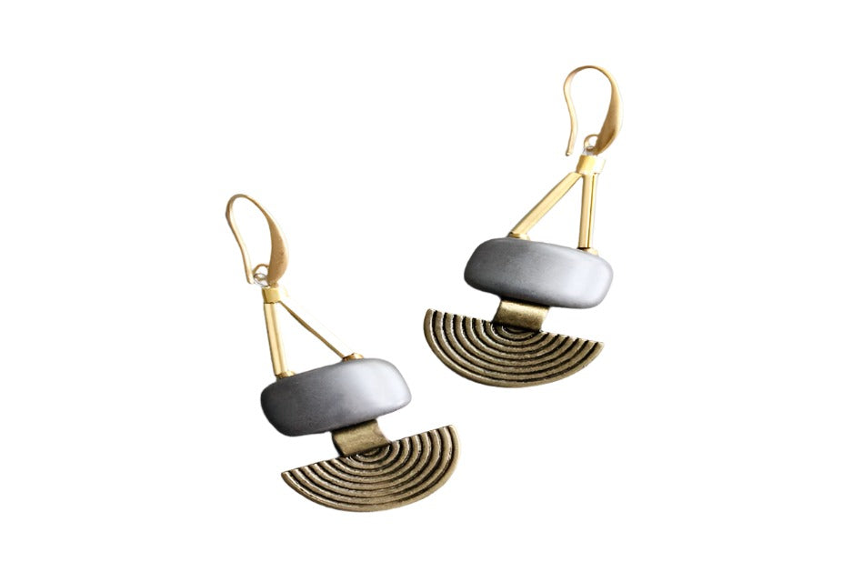 18k gold plated brass hooks with hematite and brass. Each half pair weighs .29 oz and measures 2.625 inches.