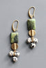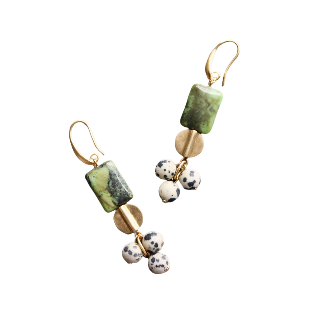 18k gold plated brass hooks with green jasper and dalmatian jasper. Each half pair weighs .26 oz and measures 2.875 inches