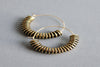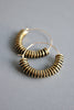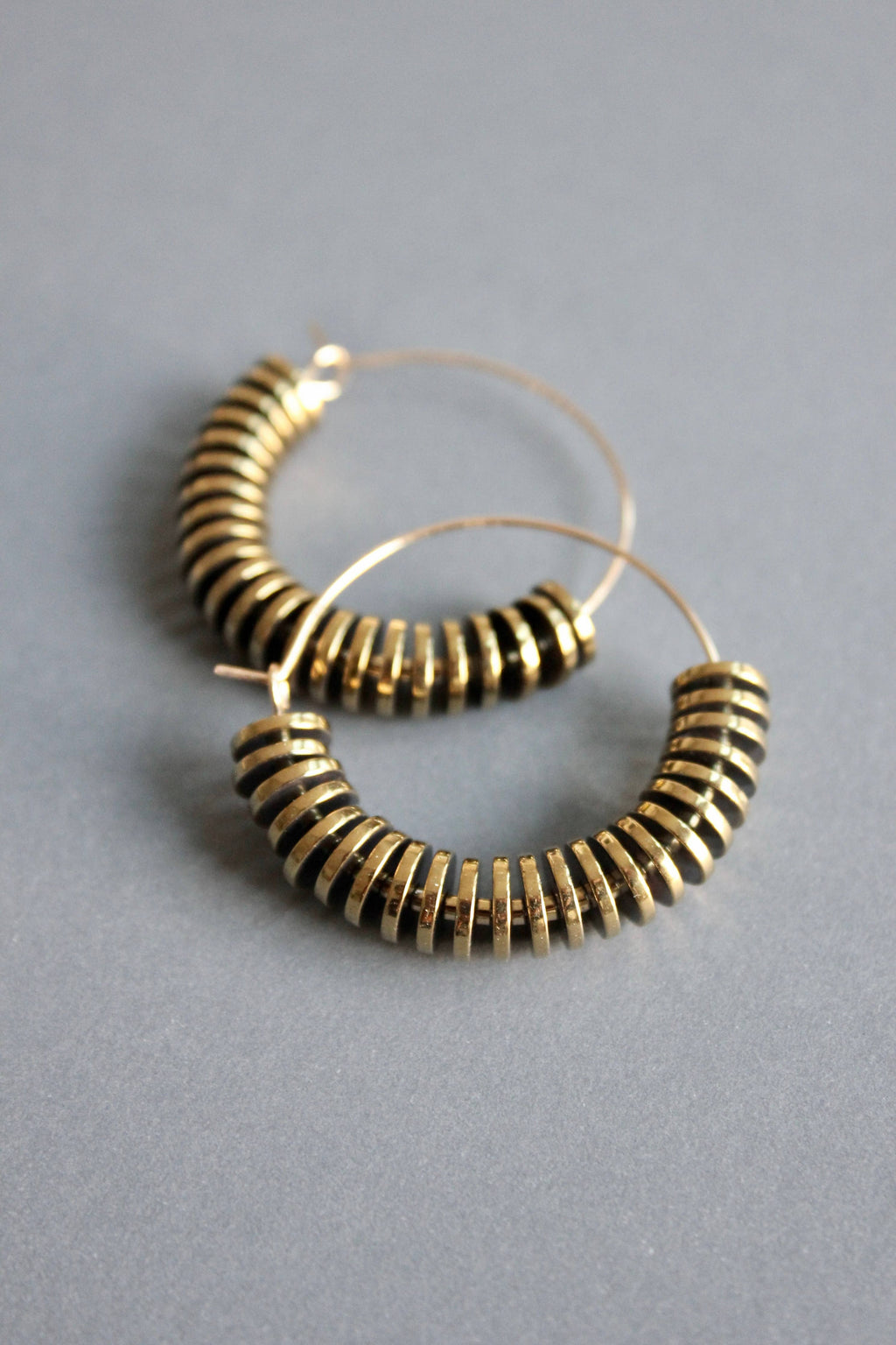Introducing our latest addition to the jewelry collection: these exquisite hoop earrings. Crafted with meticulous attention to detail, these earrings are designed to make a statement. Each hoop features a series of stacked metallic discs that create a unique, eye-catching pattern.