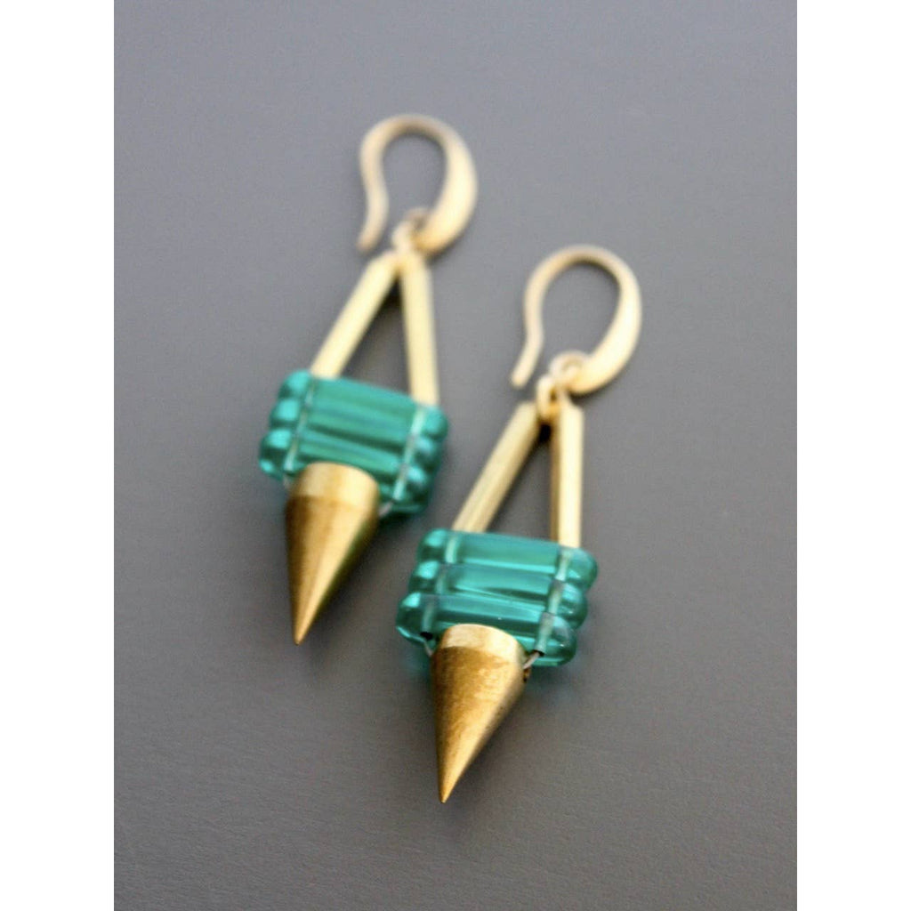 18k gold plated brass French hook earrings with Czech glass, brass spikes, and brass tubes. Each piece is unique so stones and glass may vary in shape, size, and color. Stone inclusions may be visible to the eye and are considered a part of their beauty.