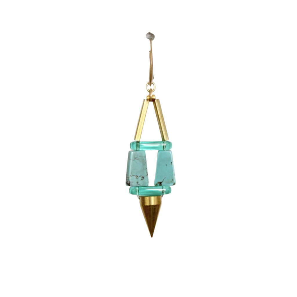 18k gold plated brass French hook earrings with turquoise, Czech glass, brass spike, and brass tubes. Each piece is unique so stones and glass may vary in shape, size, and color. Stone inclusions may be visible to the eye and are considered a part of their beauty.