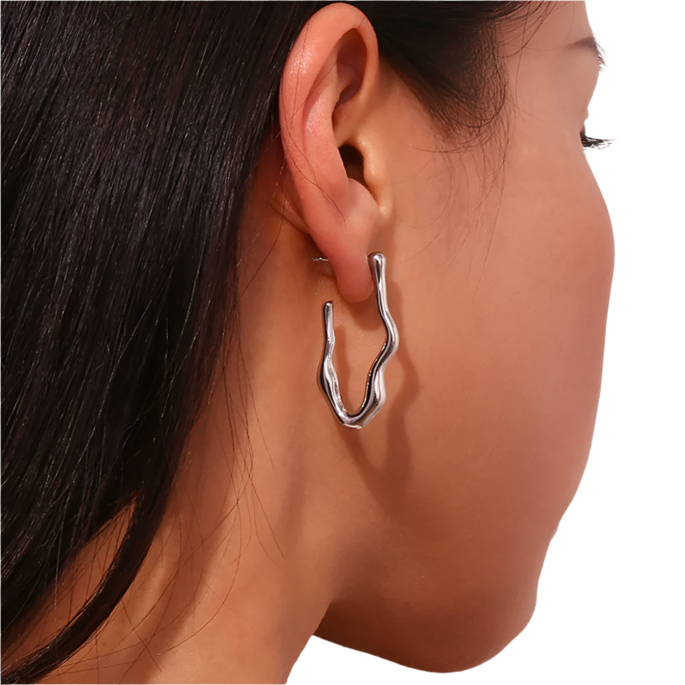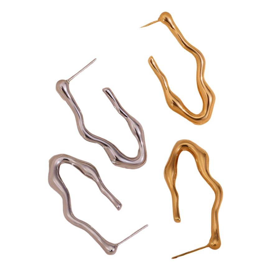 These earrings feature a freeform organic shape, giving them a modern and artistic look. The finish is polished, making them sleek and reflective, while their asymmetrical design adds a unique and trendy aesthetic.  Available in Gold or Silver.